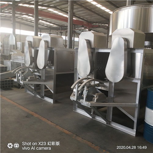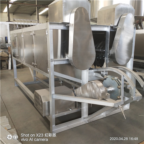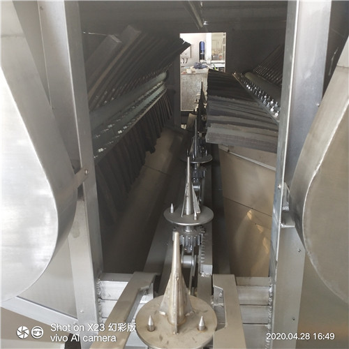 全自動豬頭打毛機是根據豬頭外型及特點進行設計的專用設備,本機采用鏈條傳送方式,連續作業,極大地減少了工作時間,提高了工作效率,在此設備前應配有燙頭池或自動燙頭機,使豬頭均勻浸燙后進入本機。只有燙好,才能取得良好的脫毛效果。本機選用可調式減速機,可以根據不同種類的豬頭來調節運行速度,以保證打毛效果。